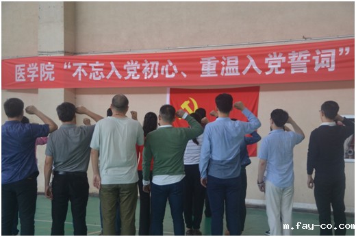 宣誓活动由学院党支部书记吴绍奎同志主持,全体党员面向鲜红的党旗庄严宣誓,一字一句、坚定有力的重温着入党之时每一位同志对党说出的庄严誓言,共产党员的自豪响彻馆间,共产党员的光荣牢记心间。通过重温誓词主题教育活动,坚定了学院全体党员为共产主义事业奋斗终身的理想信念,增强了责任感、使命感。对照誓词,全体党员结合自身实际,认真反思在学习、工作、生活中的不足,激发了全 体党员在医学院创建初期拼搏奋斗、干事创业的活力。