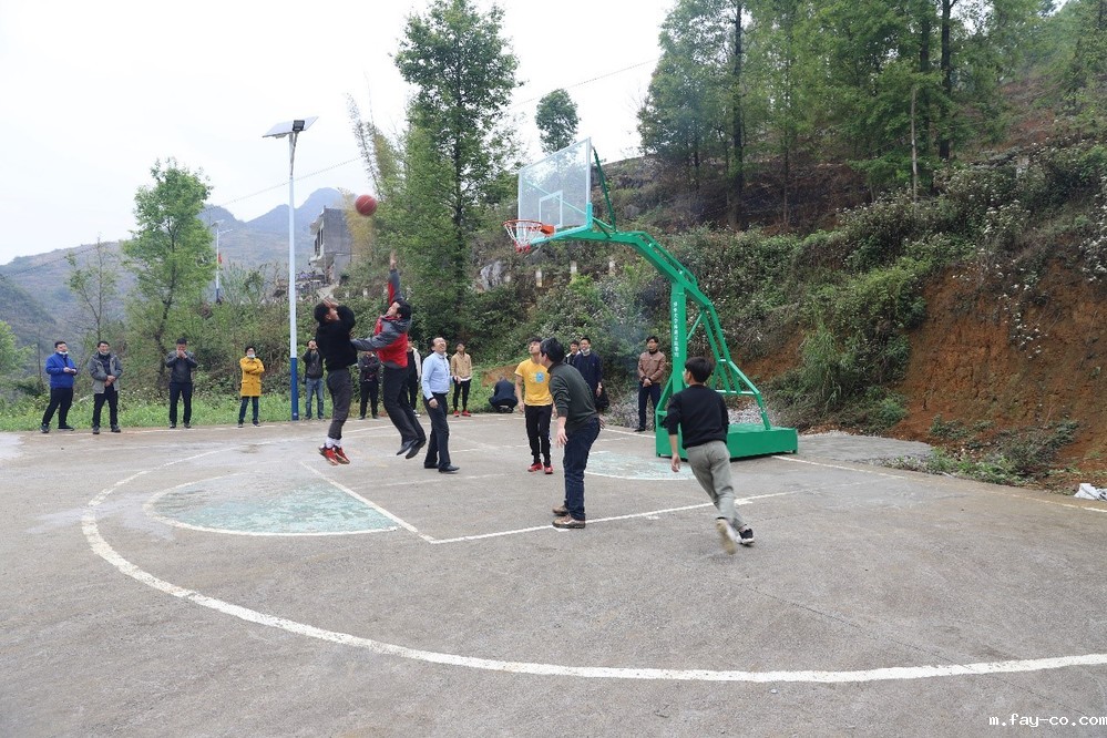 中午,在沙坪镇党委书记邱祯富的带领下,一行人抵达沙坪镇这年村。这年村一直以来缺乏健身器材,村民没有健身的场所,为丰富村民群众日常文化生活,在体育学院的多方联系和努力下,向这年村捐赠了移动篮球架,现已安装调试完成并投入使用。当抵达运动场地时,这年村的年轻人也正在场地上进行篮球运动,肖内昆书记即兴邀请吴绍奎副书记和潘学军副院长组成一队,与正在运动的当地村民展开了一场篮球友谊赛。