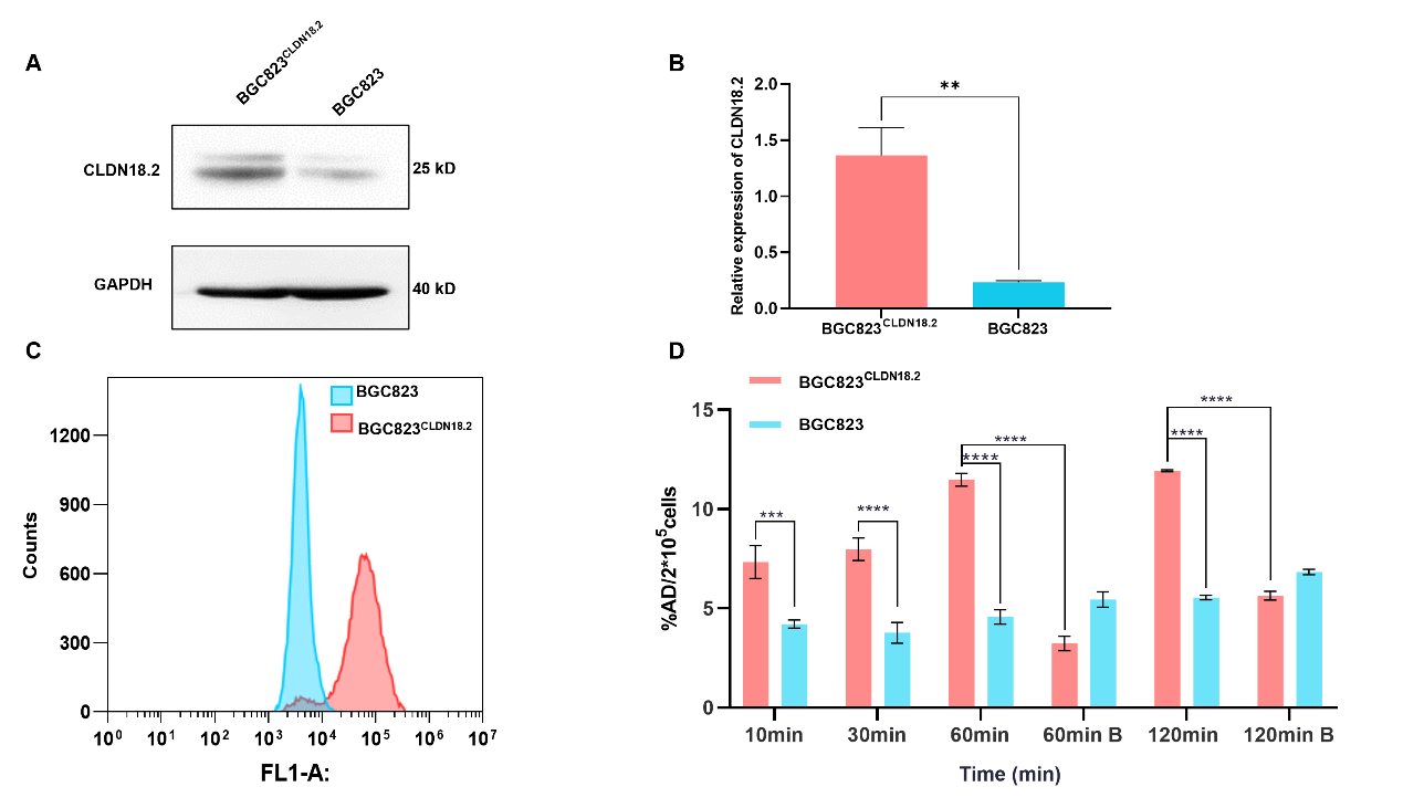 图3. CLDN18.2在两种细胞系中的表达水平检测,以及[89Zr]Zr-DFO-TST001的细胞摄取。(A) BGC823CLDN18.2和BGC823细胞Western blot分析结果。(B)CLDN18.2在BGC823CLDN18.2和BGC823细胞中的相对表达率(结果显示为SD±平均值,n = 3)。(C)BGC823CLDN18.2和BGC823细胞的流式细胞术直方图结果。(D)BGC823CLDN18.2和BGC823细胞中[89Zr]Zr-DFO-TST001的细胞摄取实验结果。(**, P< 0.05, ***, P< 0.001, ****, P< 0.0001)。