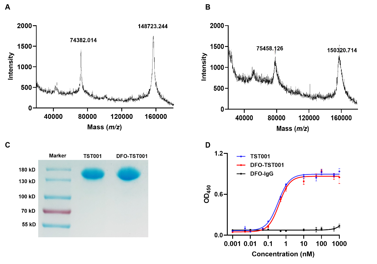 图1. TST001和DFO-TST001的分子表征。(A)TST001 的MALDI-TOF-MS分析。(B) DFO-TST001的MALDI-TOF-MS分析。(C)TST001和DFO-TST001的SDS-PAGE表征(D)通过ELISA评估TST001和DFO-TST001与人CLDN18.2蛋白的结合力。
